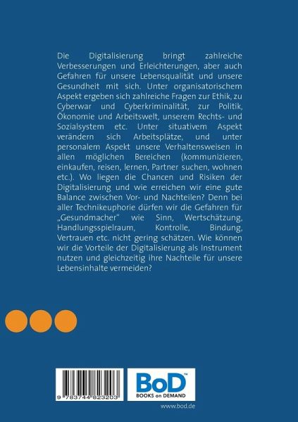 Die Digitalisierung bringt zahlreiche Verbesserungen und Erleichterungen, aber auch Gefahren für unsere Lebensqualität und unsere Gesundheit mit sich. Unter organisatorischem Aspekt ergeben sich zahlreiche Fragen zur Ethik, zu Cyberwar und Cyberkriminalität, zur Politik, Ökonomie und Arbeitswelt, unserem Rechts- und Sozialsystem etc. Unter situativem Aspekt verändern sich Arbeitsplätze, und unter personalem Aspekt unsere Verhaltensweisen in allen möglichen Bereichen (kommunizieren, einkaufen, reisen, lernen, Partner suchen, wohnen etc.). Wo liegen die Chancen und Risiken der Digitalisierung und wie erreichen wir eine gute Balance zwischen Vor- und Nachteilen? Denn bei aller Technikeuphorie dürfen wir die Gefahren für Gesundmacher wie Sinn, Wertschätzung, Handlungsspielraum, Kontrolle, Bindung, Vertrauen etc. nicht gering schätzen. Wie können wir die Vorteile der Digitalisierung als Instrument nutzen und gleichzeitig ihre Nachteile für unsere Lebensinhalte vermeiden?