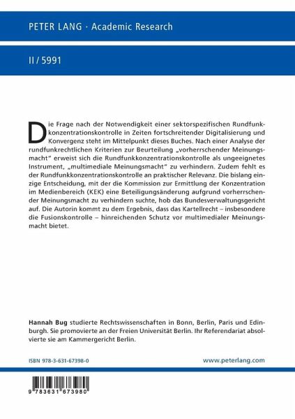 Die Frage nach der Notwendigkeit einer sektorspezifischen Rundfunkkonzentrationskontrolle in Zeiten fortschreitender Digitalisierung und Konvergenz steht im Mittelpunkt dieses Buches. Nach einer Analyse der rundfunkrechtlichen Kriterien zur Beurteilung "vorherrschender Meinungsmacht" erweist sich die Rundfunkkonzentrationskontrolle als ungeeignetes Instrument, "multimediale Meinungsmacht" zu verhindern. Zudem fehlt es der Rundfunkkonzentrationskontrolle an praktischer Relevanz. Die bislang einzige Entscheidung, mit der die Kommission zur Ermittlung der Konzentration im Medienbereich (KEK) eine Beteiligungsänderung aufgrund vorherrschender Meinungsmacht zu verhindern suchte, hob das Bundesverwaltungsgericht auf. Die Autorin kommt zu dem Ergebnis, dass das Kartellrecht - insbesondere die Fusionskontrolle - hinreichenden Schutz vor multimedialer Meinungsmacht bietet.