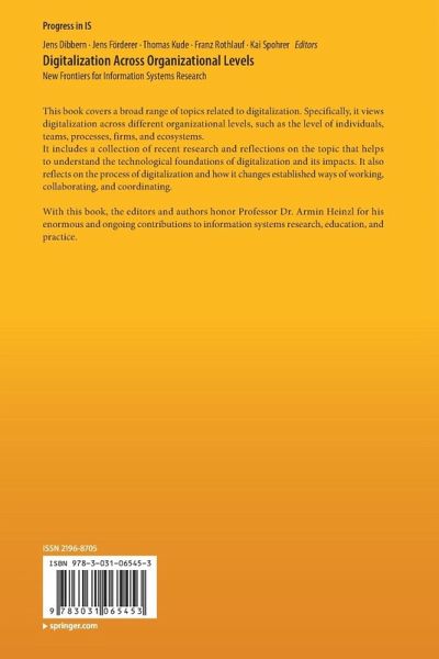 This book covers a broad range of topics related to digitalization. Specifically, it views digitalization across different organizational levels, such as the level of individuals, teams, processes, firms, and ecosystems. It includes a collection of recent research and reflections on the topic that helps to understand the technological foundations of digitalization and its impacts. It also reflects on the process of digitalization and how it changes established ways of working, collaborating, and coordinating. With this book, the editors and authors honor Professor Dr. Armin Heinzl for his…mehr