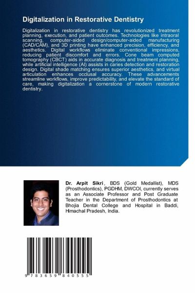 Digitalization in restorative dentistry has revolutionized treatment planning, execution, and patient outcomes. Technologies like intraoral scanning, computer-aided design/computer-aided manufacturing (CAD/CAM), and 3D printing have enhanced precision, efficiency, and aesthetics. Digital workflows eliminate conventional impressions, reducing patient discomfort and errors. Cone beam computed tomography (CBCT) aids in accurate diagnosis and treatment planning, while artificial intelligence (AI) assists in caries detection and restoration design. Digital shade matching ensures superior aesthetics, and virtual articulation enhances occlusal accuracy. These advancements streamline workflows, improve predictability, and elevate the standard of care, making digitalization a cornerstone of modern restorative dentistry.