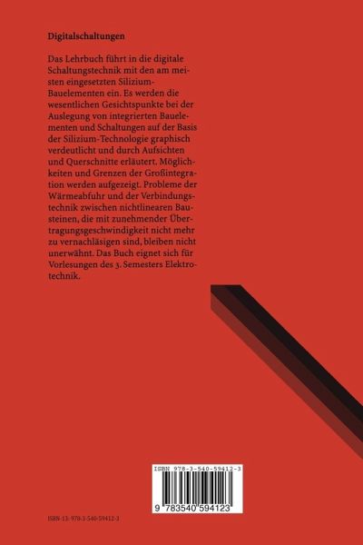 Das Lehrbuch führt in die digitale Schaltungstechnik mit den am meisten eingesetzten Siliziumbauelementen ein. Es werden die wesentlichen Gesichtspunkte bei der Auslegung von integrierten Bauelementen und Schaltungen auf der Basis der Siliziumtechnologie graphisch verdeutlicht und durch Aufsichten und Querschnitte erläutert. Möglichkeiten und Grenzen der Großintegration werden aufgezeigt. Probleme der Wärmeabfuhr und der Verbindungstechnik zwischen nichtlinearen Bausteinen, die mit zunehmender Übertragungsgeschwindigkeit nicht mehr zu vernachlässigen sind, bleiben nicht unerwähnt. Das Buch eignet sich für Vorlesungen des dritten Semesters Elektrotechnik. Das Lehrbuch führt in die digitale Schaltungstechnik mit den am meisten eingesetzten Silizium-Bauelementen ein. Es werden die wesentlichen Gesichtspunkte bei der Auslegung von integrierten Bauelementen und Schaltungen auf der Basis der Silizium-Technologie graphisch verdeutlicht und durch Aufsichten und Querschnitte erläutert. Möglichkeiten und Grenzen der Großintegration werden aufgezeigt. Probleme der Wärmeabfuhr und der Verbindungstechnik zwischen nichtlinearen Bausteinen, die mit zunehmender Übertragungsgeschwindigkeit nicht mehr zu vernachlässigen sind, bleiben nicht unerwähnt. Das Buch eignet sich für Vorlesungen des 3. Semesters Elektrotechnik.