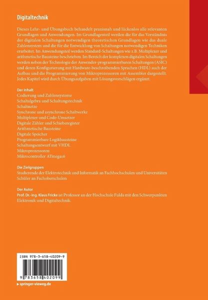 Dieses Lehr- und Übungsbuch behandelt praxisnah und lückenlos alle relevanten Grundlagen und Anwendungen. Im Grundlagenteil werden die für das Verständnis der digitalen Schaltungen notwendigen theoretischen Grundlagen wie das duale Zahlensystem und die für die Entwicklung von Schaltungen notwendigen Techniken erarbeitet. Im Anwendungsteil werden Standard-Schaltungen wie z.B. Multiplexer und arithmetische Bausteine beschrieben. Im Bereich der komplexen digitalen Schaltungen werden neben der Technologie der Anwender-programmierbaren Schaltungen (ASIC) und deren Konfigurierung mit Hardware-beschreibenden Sprachen (HDL) auch der Aufbau und die Programmierung von Mikroprozessoren mit Assembler dargestellt. Jedes Kapitel wird durch Übungsaufgaben mit Lösungsvorschlägen ergänzt.
