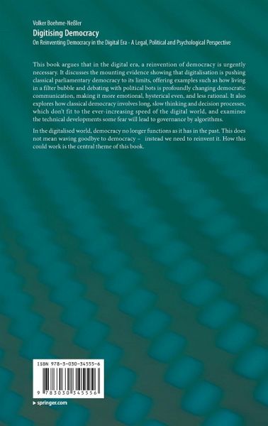 This book argues that in the digital era, a reinvention of democracy is urgently necessary. It discusses the mounting evidence showing that digitalisation is pushing classical parliamentary democracy to its limits, offering examples such as how living in a filter bubble and debating with political bots is profoundly changing democratic communication, making it more emotional, hysterical even, and less rational. It also explores how classical democracy involves long, slow thinking and decision processes, which don't fit to the ever-increasing speed of the digital world, and examines the technical developments some fear will lead to governance by algorithms.In the digitalised world, democracy no longer functions as it has in the past. This does not mean waving goodbye to democracy - instead we need to reinvent it. How this could work is the central theme of this book.