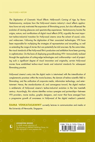 While many books have addressed visual effects in Hollywood cinema, The Digitization of Cinematic Visual Effects: Hollywood's Coming of Age, by Rama Venkatasawmy, fills an important gap in cinematic analysis and film history by providing a periodization and techno-historical account of visual effects in Hollywood cinema.