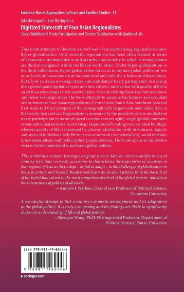 This book attempts to develop a novel way of conceptualizing regionalism under hyper-globalization. Until recently, regionalism has been often framed in terms of economic interdependence and security connectivity in which sovereign states are the key navigators within the liberal world order. Under hyper-globalization in the third millennium, hyper-globalization forces us to capture global politics at two more levels of measurement at the state level and both there below and there above. First, how 29 Asian sovereign states join multilateral treaty participation to develop their global quasi-legislative types and how citizens' satisfaction with quality of life in 29 civil societies shapes their societal types. Second, relating these two features above and below sovereign states, the book attempts to measure the features and speculate on the futures of four Asian regionalisms (Central Asia, South Asia, Southeast Asia and East Asia) and their prospect of the demographically largest continent called Asia in the twenty-first century. Regionalism is measured by the proclivity of 600 multilateral treaty participation in terms of speed (cautious versus agile), angle (global commons versus individual interests) and strategy (aspirational bonding versus mutual binding), whereas quality of life is measured by citizens' satisfaction with 16 domains, aspects and styles of individual daily life in terms of survival (or materialism), social relations (post-materialism) and public policy preponderance. The book opens an innovative vista to better understand tumultuous global politics.