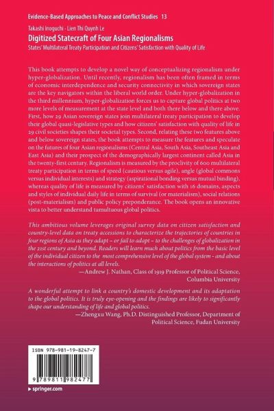 This book attempts to develop a novel way of conceptualizing regionalism under hyper-globalization. Until recently, regionalism has been often framed in terms of economic interdependence and security connectivity in which sovereign states are the key navigators within the liberal world order. Under hyper-globalization in the third millennium, hyper-globalization forces us to capture global politics at two more levels of measurement at the state level and both there below and there above. First, how 29 Asian sovereign states join multilateral treaty participation to develop their global quasi-legislative types and how citizens' satisfaction with quality of life in 29 civil societies shapes their societal types. Second, relating these two features above and below sovereign states, the book attempts to measure the features and speculate on the futures of four Asian regionalisms (Central Asia, South Asia, Southeast Asia and East Asia) and their prospect of the demographically largest continent called Asia in the twenty-first century. Regionalism is measured by the proclivity of 600 multilateral treaty participation in terms of speed (cautious versus agile), angle (global commons versus individual interests) and strategy (aspirational bonding versus mutual binding), whereas quality of life is measured by citizens' satisfaction with 16 domains, aspects and styles of individual daily life in terms of survival (or materialism), social relations (post-materialism) and public policy preponderance. The book opens an innovative vista to better understand tumultuous global politics.