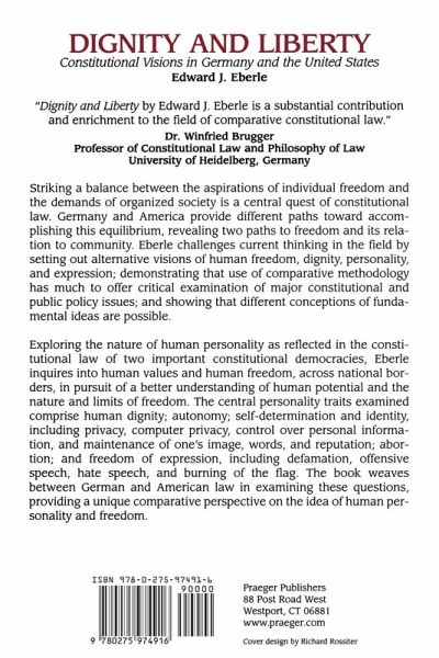 Striking a balance between the aspirations of individual freedom and the demands of organized society is a central quest of constitutional law. Germany and America provide different paths toward accomplishment of this equilibrium, revealing two paths to freedom and its relation to community. This work is addressed to philosophers of law, political theorists, constitutional lawyers, and everyone interested in protecting human rights and learning the meaning of human personality and freedom as expressed in democratic constitutional regimes. Eberle challenges current thinking in the field by setting out alternative visions of human freedom, dignity, personality and expression; demonstrating that use of comparative methodology has much to offer critical examination of major constitutional and public policy issues; and showing that different conceptions of fundamental ideas are possible. Exploring the nature of human personality as reflected in the constitutional law of two important constitutional democracies, Eberle inquires into human values and human freedom, across national borders, in pursuit of a better understanding of human potential and the nature and limit of freedom. The central personality traits examined comprise human dignity; autonomy; self-determination and identity, including privacy, computer privacy, control over personal information, and maintenance of one's image, words, and reputation; abortion; and freedom of expression, including defamation, offensive speech, hate speech, and burning of the flag. The book weaves between German and American law in examining these questions, providing a unique comparative perspective on the idea of human personality and freedom.
