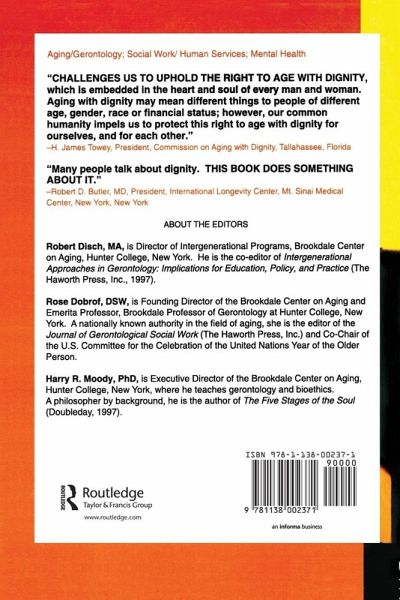 Dignity and Old Age explores the meaning of dignity and its implications for how we look upon old age and older people. It will give you an appreciation of the multiple meanings of dignity across different sectors of society. The contributors assert that the ideal of human dignity conveys important implications for how we treat older people at the level of practicefor example, in health care or social servicesand also for our policies governing work and retirement as well as entitlements and benefits. Individuals and families, as well as philanthropy and government, have a role in assuring dignity in age, and professionals in the aging service network can enhance the quality of their care. This book will give you new and important insight for taking important steps forward in framing the issues and fulfilling a commitment to assuring dignity for all those in the last stage of life.