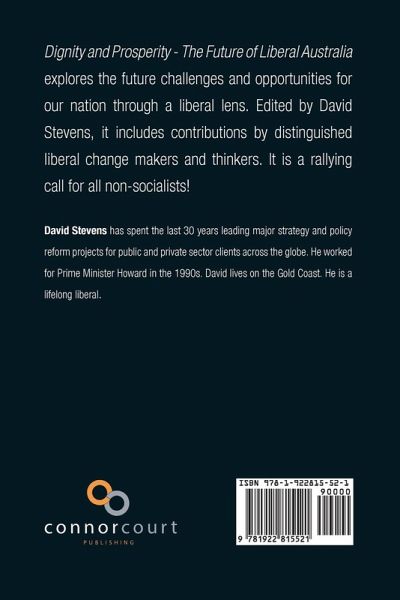 Dignity and Prosperity - The Future of Liberal Australia brings together, for the first time, Australia's leading liberal luminaries or 'grandees' in one place for the purpose of reigniting a renaissance of the Liberal cause. The distinguished contributors all have extensive experience in their respective fields, and now bring their expertise, knowledge, and insight to design a policy program based around the core values of liberalism - personal autonomy and personal responsibility, free market and entrepreneurship, opportunity and security, limited government and sound fiscal and economic management. They know that a strong economy leads to strong finances, which in turn provide for strong national defence and together create the foundations for a strong civic society. This is the virtue of a successful liberal democracy. Contents Foreword: The foundations of Australia's liberal democracy David Stevens Acknowledgments 1: Enduring liberal principles for successful government John Howard OM AC 2: The continuing relevance of Menzies's liberal legacy Georgina Downer 3: Stronger Regions, Stronger Nation John Anderson AC 4: Achieving human dignity: challenges to liberalism David Kemp AC 5: Lessons for liberals from the Anglosphere Tom Switzer 6: Liberal party foreign policy Alexander Downer AC 7: Why debt and deficit matter: Building an opportunity society requires ethical budgeting Rod Kemp AM 8: The role and size of government Nick Minchin AO 9: National prosperity and global competitiveness Hugh Morgan AO with David Stevens 10: Reforming Industrial Relations Judith Sloan 11: Climate, energy and the new forgotten people Daniel Wild 12: Freedom of speech and diversity of expression Richard Alston AO 13: Fixing our education failures John Roskam Afterword: Tony Abbott AC David Stevens has spent the last 30 years leading major strategy and policy reform projects for public and private sector clients across the globe. He worked for Prime Minister Howard in the 1990s. David lives on the Gold Coast. He is a lifelong liberal.