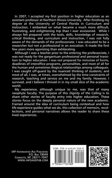 The purpose of this Dignity of the Calling is to share other stories of faculty entry into higher education. These stories focus on the deeply personal nature of the new academic. Framed around the idea of curriculum being contextual and how life experience guides what we do, this collection of memoirs, recollections, and personal narratives allows the reader to share these lived experiences. Although I was a teacher prior to the entering the professoriate, I was not ready for the gargantuan professional and personal transition to higher education. I was not prepared for minutiae of forms, deadlines of inter-office programs, personalities, and most of all for the human and sometimes illogical relationships among colleagues. I was caught off-guard by the nuanced thinking of students; and most of all, I was, at times, overwhelmed by the time constraints of research, teaching and service on me and my family. However, I survived, and I believe I thrived in in my small slice of the academic world.