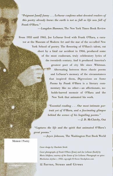 An unprecedented eyewitness account of the New York School, as seen between the lines of O'Hara's poetry Joe LeSueur lived with Frank O'Hara from 1955 until 1965, the years when O'Hara wrote his greatest poems, including 'To the Film Industry in Crisis', 'In Memory of My Feelings', 'Having a Coke with You', and the famous Lunch Poems-so called because O'Hara wrote them during his lunch break at the Museum of Modern Art, where he worked as a curator. (The artists he championed include Jackson Pollock, Joseph Cornell, Grace Hartigan, Jane Freilicher, Joan Mitchell, and Robert Rauschenberg.) The flowering of O'Hara's talent, cut short by a fatal car accident in 1966, produced some of the most exuberant, truly celebratory lyrics of the twentieth century. And it produced America's greatest poet of city life since Whitman. Alternating between O'Hara's poems and LeSueur's memory of the circumstances that inspired them, Digressions on Some Poems by Frank O'Hara is a literary commentary like no other--an affectionate, no-holds-barred memoir of O'Hara and the New York that animated his work: friends, lovers, movies, paintings, streets, apartments, music, parties, and pickups. This volume, which includes many of O'Hara's best-loved poems, is the most intimate, true-to-life portrait we will ever have of this quintessential American figure and his now legendary times.