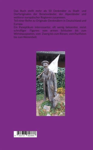 Das Buch stellt mehr als 50 Denkmäler zu Stadt- und Dorforiginalen der Beneluxländer, der Alpenländer und der Slowakei zusammen.Teil einer Reihe zu Originaledenkmälern in Deutschland und Europa.Ein Panoptikum interessanter oft wenig bekannter, oft schrulliger Figuren, vom armen Schlucker bis zum letzten Heimweber, vom Riesen bis zum Zwerg, vom Pazifisten bis zum Wirtshauspoeten.