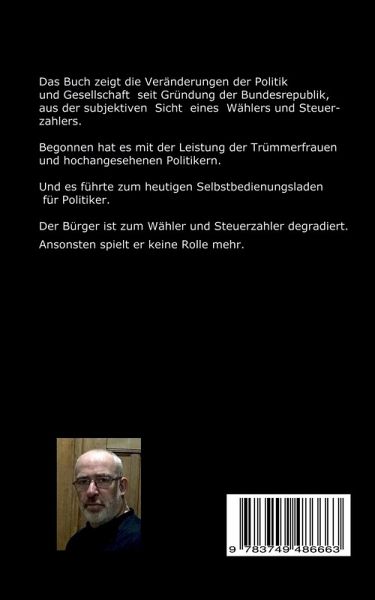 Seit Gründung der Bundesrepublik hat unser Land mit seinen Bürgerinnen und Bürgern zahlreiche Veränderungen durchgemacht. Anfangs war es wichtig das Land auf der einen Seite wieder aufzubauen und andererseits außenpolitisch aktiv zu werden, um mit ehemaligen Erzfeinden politisch stabile Beziehungen zu schaffen. Das Buch beschreibt die Leistung der Trümmerfrauen, das Wirtschaftswunder, und die rasante Entwicklung des Landes genauso wie die gesellschaftlichen Veränderungen. Es gab da Zeiten, wo man jedes Haus unverschlossen verlassen konnte, ohne dass irgendetwas geklaut worden wäre.Aber auch die Politiker waren andere als heute. Es war Ihnen wichtig, wie es den Leuten ging, und Sie suchten den realen Kontakt zum Bürger um zu erfahren, wo Sorgen und Nöte am größten waren.Irgendwann kehrte sich das dann um und das Land wurde zu einem Selbstbedienungsladen für Politiker und ihre persönlichen Interessen. Und das bis heute. Es wird geschrieben aus der Sicht eines Bürgers und Wählers, der heute zu nichts anderem mehr da ist, um Steuern zu bezahlen und bei Wahlen den Politiker, der nur noch an sich denkt, in seinem Amt zu halten.