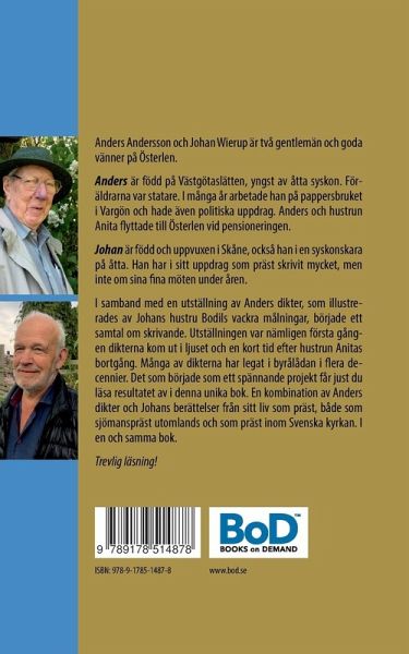 Anders Andersson och Johan Wierup är två gentlemän och goda vänner på Österlen. I samband med en utställning av Anders dikter, som illustrerades av Johans hustrus vackra målningar, började ett samtal om skrivande. Ett spännande projekt som just du får läsa resultatet av i denna bok. En kombination av Anders dikter och Johans berättelser från sitt liv som präst, både som sjömanspräst utomlands och som präst inom Svenska kyrkan. I en och samma bok. Trevlig läsning!