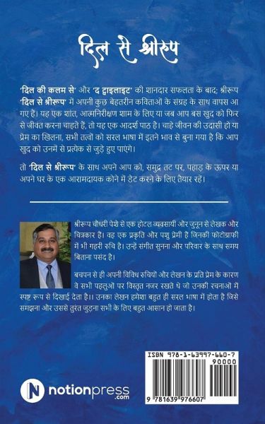 Your search for a collection of priceless poems ends here. After great success of 'Dil Ki Kalam Se' and 'The Twilight'; Srirup is back with collection of some of his best poetries in 'Dil Se Srirup'. It is a perfect read for a quiet, introspective evening or when you simply want to rejuvenate yourself. Whether it is life's melancholy or the blossoming of love, all the elements have been woven so passionately in simple language that you'll find yourself connected with each of them. So be ready to date yourself, at the beach, atop a mountain or in a cozy corner of your home with 'Dil Se Srirup'.