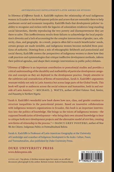 In Dilemmas of Difference Sarah A. Radcliffe explores the relationship of rural indigenous women in Ecuador to the development policies and actors that are ostensibly there to help ameliorate social and economic inequality. Radcliffe finds that development policies's inability to recognize and reckon with the legacies of colonialism reinforces long-standing social hierarchies, thereby reproducing the very poverty and disempowerment they are there to solve. This ineffectiveness results from failures to acknowledge the local population's diversity and a lack of accounting for the complex intersections of gender, race, ethnicity, class, and geography. As a result, projects often fail to match beneficiaries' needs, certain groups are made invisible, and indigenous women become excluded from positions of authority. Drawing from a mix of ethnographic fieldwork and postcolonial and social theory, Radcliffe centers the perspectives of indigenous women to show how they craft practices and epistemologies that critique ineffective development methods, inform their political agendas, and shape their strategic interventions in public policy debates.