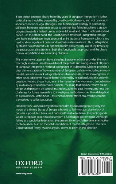 If one lesson emerges clearly from fifty years of European integration it is that political aims should be pursued by overtly political means, and not by roundabout economic or legal strategies. The functionalist strategy of promoting spillovers from one economic sector to another has failed to achieve a steady progress towards a federal union, as Jean Monnet and other functionalists had hoped. On the other hand, the unanticipated results of 'integration through law' have included over-regulation and an institutional framework which is too rigid to allow significant policy and institutional innovations. Thus, integration by stealth has produced sub-optimal policies and a steady loss of legitimacy by the supranational institutions. Both the functionalist approach and the classic Community Method are becoming obsolete. This major new statement from a leading European scholar provides the most thorough analysis currently available of the pitfalls and ambiguities of 50 years of European integration, without losing sight of its benefits. Majone provides a clear demonstration of how a number of European policies - including environmental protection - lack a logically defensible rationale, while showing how, in other cases, objectives may be better achieved by re-nationalizing the policy in question. He also shows how, in an information-rich environment, co-ordination by mutual adjustment becomes possible, meaning that member states are no longer as dependent on central institutions as in the past. He explains how the challenge for future research is to investigate methods-other than delegation to supranational institutions-by which member states can credibly commit themselves to collective action. Dilemmas of European Integration concludes by explaining exactly why the model of a United States of Europe is bound to fail-not just due to lack of popular support, but because it finds itself unable to deliver the public goods which Europeans expect to receive from a full fledged government. Although failing as a would-be federation, the present Union could become an effective confederation, built on the solid foundation of market integration. The new Constitutional Treaty, Majone argues, seems to point in this direction.