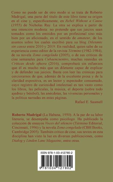 Como no puede ser de otro modo si se trata de Roberto Madrigal, una parte del título de este libro tiene su origen en el cine y, específicamente, en Rebel Without a Cause (1955) de Nicholas Ray. La otra se explica a partir de una intención modesta: no pretende que sus juicios sean tomados como los emitidos por un profesional sino más bien por un aficionado, en el sentido de amateur, de los asuntos sobre los cuales escribió para su blog Diletante sin causa entre 2010 y 2019. En realidad, quien sabe de su experiencia como editor de la revista Término (1982-1984), de su novela Zona congelada (2005), o de sus críticas de cine semanales para Cubaencuentro, muchas reunidas en Críticas desde afuera (2016), comprobará sin esfuerzos que él es mucho más que un diletante capaz de explicar y de defender sus juicios. Basta con leer las crónicas para cerciorarnos de que, además de la excelente prosa y de la claridad expositiva, es un lector y espectador consumado, cuyo registro de curiosidad intelectual es tan vasto como los libros, las películas, la música, el deporte (sobre todo ajedrez y béisbol), las anécdotas, las vivencias personales y la política narradas en estas páginas. (Rafael E. Saumell)