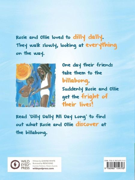 Rosie and Ollie loved to dilly dally. They walk slowly, looking at everything on the way. One day their friends take them to the billabong. Suddenly Rosie and Ollie get the fright of their lives! Read 'Dilly Dally All Day Long' to find out what Rosie and Ollie discover at the billabong. Wild Eyed Press totally supports the concept paying royalties for the use of manuscripts and artworks. Wild Eyed Press sees this as both a moral and intellectual obligation. When you read this book, you can do so with the knowledge that it was fully created by real people for real people. Creators affiliated with Wild Eyed Press sign contracts to say they do not use Artificial intelligence when illustrating or writing children's books for your child. Written and illustrated by real people for real children. Our creators care about literacy and child welfare. They support you, please support them.