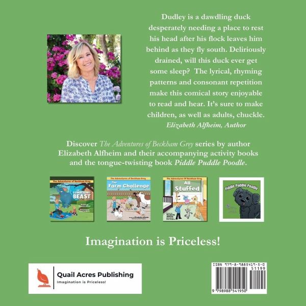 Dilly-Dally Duck: A Feathered Fiasco of Fun! Meet Dudley the duck, a feathered fellow with a fondness for...well, dilly-dallying! While his flock flies south to avoid the coming winter's chill, Dudley dawdles, daydreaming in the dew-kissed dawn. But when the wind whispers warnings and a chill starts to swirl, Dudley finds himself in a feathered fix! With no nest to rest, he must seek shelter on the farm, but getting some shut-eye seems out of reach. The plump pigs squeal, the humble horse neighs, and the secluded skunks stink - Dudley just can't seem to sleep! Join Dudley on his hilarious quest for a cozy winter haven. Packed with playful alliteration and peppy rhyming couplets, Elizabeth Alfheim's Dilly-Dally Duck is a delightful tale that tickles the ears and teaches valuable lessons. Dudley's adventure reminds us that procrastination can lead to a flurry of feathers, but with a little determination and some farmyard friends, even the most dilly-dallying duck will find his way. This charming story is perfect for: ¿ Little explorers ages 0-8: The vibrant illustrations and catchy rhymes will captivate young readers. ¿ Story time snuggles: Cuddle up and quack with laughter as Dudley's adventure unfolds. ¿ Early vocabulary builders: Fun, new words like "dilly-dally" and "dawdled and waddled" will expand little minds. ¿ Kindness cultivators: Dudley's journey teaches the importance of helping others, even when they're a bit...dilly-dallying! Don't let waddling woes get you down! Grab your copy of Dilly-Dally Duck today and embark on a feathery escapade for the whole family!