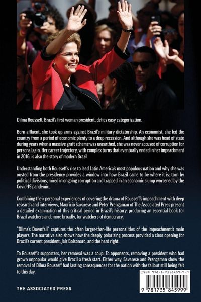"Dilma Rousseff, Brazil's first woman president, defies easy categorization. Born affluent, she took up arms against Brazil's military dictatorship. An economist, she led the country from a period of economic plenty to a deep recession. And although she was head of state during years when a massive graft scheme was unearthed, she was never accused of corruption for personal gain. Her career trajectory, with complex turns that eventually ended in her impeachment in 2016, is also the story of modern Brazil. Understanding both Rousseff's rise to lead Latin America's most populous nation and why she was ousted from the presidency provide a window into how Brazil came to be where it is: torn by political divisions, mired in ongoing corruption and trapped in an economic slump worsened by the Covid-19 pandemic. Combining their personal experiences of covering the drama of Rousseff's impeachment with deep research and interviews, Mauricio Savarese and Peter Prengaman of The Associated Press present a detailed examination of this critical period in Brazil's history, producing an essential book for Brazil watchers and, more broadly, for watchers of democracy. "Dilma's Downfall" captures the often larger-than-life personalities of impeachment's main players. The narrative also shows how the deeply polarizing process provided a clear opening for Brazil's current President, Jair Bolsonaro, and the hard right. To Rousseff's supporters, her removal was a coup. To opponents, removing a president who had grown unpopular would give Brazil a fresh start. Either way, Savarese and Prengaman show the removal of Dilma Rousseff had lasting consequences for the nation with the fallout still being felt to this day."