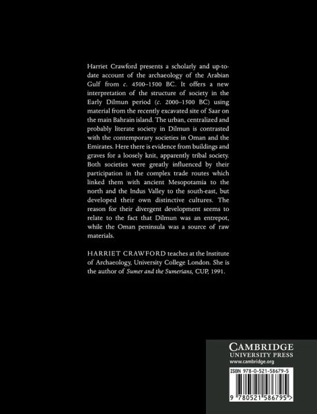 Harriet Crawford presents a scholarly account of the archaeology of the Arabian Gulf from c.4500-1500 BC. It offers an interpretation of the structure of society in the Early Dilmun period (c.2000-1500 BC) using material from the excavated site of Saar on the main Bahrain island. The urban, centralized and probably literate society in Dilmun is contrasted with the contemporary societies in Oman and the Emirates. Here there is evidence from buildings and graves for a loosely knit, apparently tribal society. Both societies were greatly influenced by their participation in the complex trade routes which linked them with ancient Mesopotamia to the north and the Indus Valley to the south east, but developed their own distinctive cultures. The reason for their divergent development seems to relate to the fact that Dilmun was an entrepot, while the Oman peninsula was a source of raw materials.