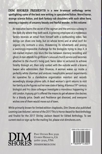Dim Shores Presents is a new bi-annual anthology series spotlighting some of the best new writing in speculative fiction. Weird horror, strange science fiction, and dark fantasy rub shoulders with each other here, weaving a tapestry of uncanny beauty and fearful wonder. In this volume: An executive learns the secret of the ragman and the ominous subway in the dark city where they both work. A grieving employee at a mysterious factory receives an email from himself with a confounding video. Two beings can share one body, but on whose terms and at what cost? An organic city contracts a virus, threatening its inhabitants and posing a seemingly-impossible challenge for the biologists trying to stop it. A red-market implant chip blurs the line between memory recording and ghost. A man attends his girlfriend's unusual church service and becomes attached to the church's living god. Twins labor in seclusion to achieve Totality through art, their only contact with the outside world a bizarre lawyer who administers their finances. A woman wakes up inside a perfectly white chamber and endures inexplicable aerosol experiments. An operative for a clandestine organization monitors and records exceedingly strange phone calls. A dead woman's spirit returns to visit her family as she figures out her new state of being. A famous 19th-century biologist and his close colleague investigate a monstrous happening in old London. A young girl is offered the means to get whatever she desires for a bloody price. Death and Pestilence get divorced, and everyone wishes one of them would move out of town. While primarily known for limited-edition chapbooks, Dim Shores also published Looming Low Volume I, winner of the 2017 This Is Horror Award for Best Anthology and finalist for the 2017 Shirley Jackson Award for Edited Anthology. To see current stock or sign up for the mailing list, please visit dimshores.com.