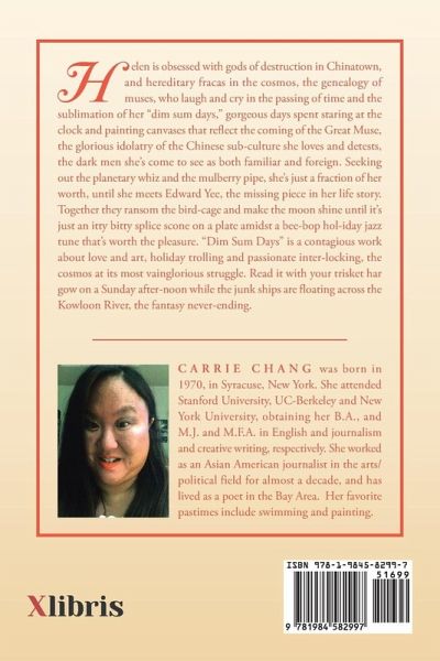 Helen is obsessed with gods of destruction in Chinatown, and hereditary fracas in the cosmos, the genealogy of muses, who laugh and cry in the passing of time and the sublimation of her "dim sum days," gorgeous days spent staring at the clock and painting canvases that reflect the coming of the Great Muse, the glorious idolatry of the Chinese sub-culture she loves and detests, the dark men she's come to see as both familiar and foreign. Seeking out the planetary whiz and the mulberry pipe, she's just a fraction of her worth, until she meets Edward Yee, the missing piece in her life story. Together they ransom the bird-cage and make the moon shine until it's just an itty bitty splice scone on a plate amidst a bee-bop hol-iday jazz tune that's worth the pleasure. "Dim Sum Days" is a contagious work about love and art, holiday trolling and passionate inter-locking, the cosmos at its most vainglorious struggle. Read it with your trisket har gow on a Sunday after-noon while the junk ships are floating across the Kowloon River, the fantasy never-ending.