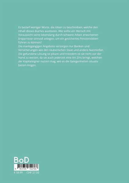 Es bedarf weniger Worte, die Ideen zu beschreiben, welche den Inhalt dieses Buches auslösten. Wie sollte ein Mensch mit Voraussicht seine lebenslang durch schwere Arbeit erworbenen Ersparnisse sinnvoll anlegen, um ein gesichertes Pensionsleben führen zu können?Die marktgängigen Angebote versorgen nur Banken und Versicherungen wie den räuberischen Staat und andere Nutznießer. Die gefundene Lösung ist pikant und trotzdem ist sie nicht vor der Hand zu weisen, da sie auch jederzeit eine Art Zins bringt, welchen der Kapitaleigner nutzen mag, wie es die Gelegenheiten situativ bieten mögen.