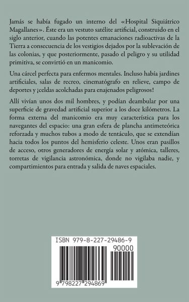 Jamás se había fugado un interno del Hospital Siquiátrico Magallanes. Éste era un vestuto satélite artificial, construido en el siglo anterior, cuando las potentes emanaciones radioactivas de la Tierra a consecuencia de los vestigios dejados por la sublevación de las colonias, y que posteriormente, pasado el peligro y su utilidad primitiva, se convirtió en un manicomio. Una cárcel perfecta para enfermos mentales. Incluso había jardines artificiales, salas de recreo, cinematógrafo en relieve, campo de deportes y ¡celdas acolchadas para enajenados peligrosos! Allí vivían unos dos mil hombres, y podían deambular por una superficie de gravedad artificial superior a los doce kilómetros. La forma externa del manicomio era muy característica para los navegantes del espacio: una gran esfera de plancha antimeteórica reforzada y muchos tubos a modo de tentáculo, que se extendían hacia todos los puntos del hemisferio celeste. Unos eran pasillos de acceso, otros generadores de energía solar y atómica, talleres, torretas de vigilancia astronómica, donde no vigilaba nadie, y compartimientos para entrada y salida de naves espaciales.