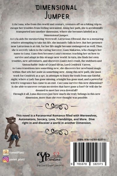 Lyla Luna, who from this world and century, ventures off on a hiking trip to escape her troubles from feeling unwanted. Along her path, she is accidentally transported into another dimension, where she becomes labeled as a Dimensional Jumper. As Lyla aids the mesmerizing Werewolf, Latravious Ellwood, due to a menacing relative attempting to take his life, she instantly falls in love. But her presence near Latravious is at risk, for her life might become endangered as well. Thus, she is secretly taken to the caring Sorcerer, Liam Makarios, who changes her name to Luna. Liam then becomes Luna's mentor; teaching her on how to survive and adapt in this strange new world. In turn, she finds her own troubles, new adventures, and discovers Liam's love crush, the stubborn and 'Untouchable' Duke of Grand Silvas, Lord Cendrick Varren. As Luna transitions into something new, she discovers her newfound magic within; that sets her aside as something new. Along this new path, she must work for Cendrick as a spy, in attempts to learn the truth from one fateful night; where a Lady has gone missing, a knight has gone mad, and a powerful witch's vengeance has come to an end. Can Luna survive this new dimension? Is she able to uncover certain mysteries that have gone a foot? Or will she be doomed to meet her own downfall? Through it all, Luna discovers just how much she truly belongs in this new dimension, more than she ever thought was possible.