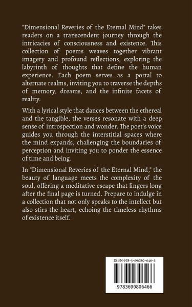 "Dimensional Reveries of the Eternal Mind" takes readers on a transcendent journey through the intricacies of consciousness and existence. This collection of poems weaves together vibrant imagery and profound reflections, exploring the labyrinth of thoughts that define the human experience. Each poem serves as a portal to alternate realms, inviting you to traverse the depths of memory, dreams, and the infinite facets of reality. With a lyrical style that dances between the ethereal and the tangible, the verses resonate with a deep sense of introspection and wonder. The poet's voice guides you through the interstitial spaces where the mind expands, challenging the boundaries of perception and inviting you to ponder the essence of time and being. In "Dimensional Reveries of the Eternal Mind," the beauty of language meets the complexity of the soul, offering a meditative escape that lingers long after the final page is turned. Prepare to indulge in a collection that not only speaks to the intellect but also stirs the heart, echoing the timeless rhythms of existence itself.