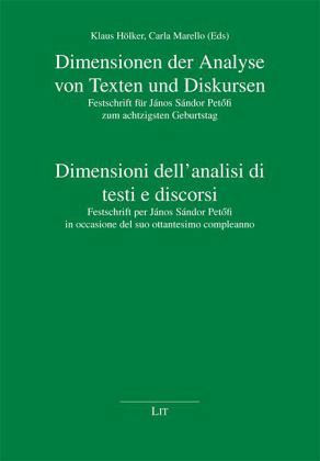 Diesen Band widmen Kolleg(inn)en und ehemalige Schüler(in nen) János Sándor Petofi zu seinem achtzigsten Geburtstag. Die Beiträge, auf Schwedisch, Italienisch, Spanisch, Deutsch, Französisch, Englisch oder Ungarisch verfasst, stammen von ausgewiesenen Forscher(inne)n auf dem Gebiet der Text- und Diskursanalyse, nämlich von Sture Allén (Göteborg), Anna Arfelli Galli (Macerata), Antal Bókay (Pécs), Ramona Bongelli (Macerata), Margarita Borreguero Zuloaga (Heidelberg / Madrid), Michel Charolles (Paris), Hans-Jürgen Eikmeyer (Bielefeld), Giuseppe Galli (Macerata), Roland Harweg (Bochum), Wolfgang Heydrich (Bochum), Klaus Hölker (Hannover), László Imre Komlósi (Pécs / Nitra), Marcello La Matina (Macerata), Carla Marello (Torino), Dieter Metzing (Bielefeld), Ilaria Riccioni (Macerata), Hannes Rieser (Bielefeld), Emel Sözer-Huber (Duisburg-Essen), Teun A. van Dijk (Barcelona), Luciano Vitacolonna (Chieti-Pescara), Gábor Tolcsvai Nagy (Budapest) und An drzej Zuczkowski (Macerata).