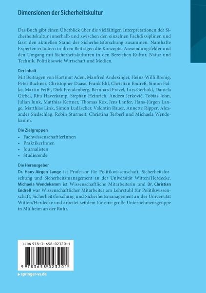 Das Buch gibt einen Überblick über die vielfältigen Interpretationen der Sicherheitskultur innerhalb und zwischen den einzelnen Fachdisziplinen und fasst den aktuellen Stand der Sicherheitsforschung zusammen. Namhafte Experten erläutern in ihren Beiträgen die Konzepte, Anwendungsfelder und den Umgang mit Sicherheitskulturen in den Bereichen Kultur, Natur und Technik, Politik sowie Wirtschaft und Medien.