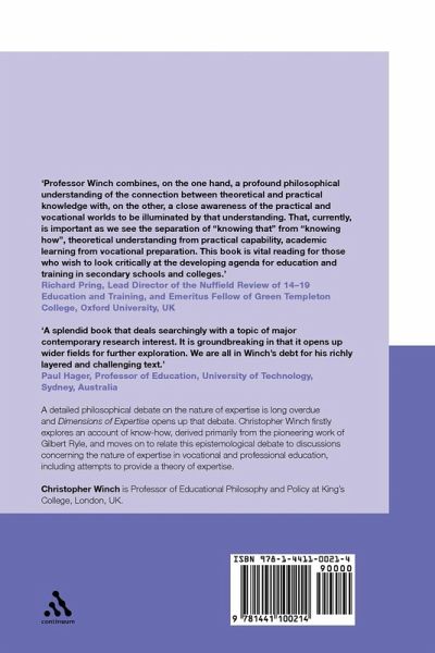 A detailed philosophical debate on the nature of expertise is long overdue and Dimensions of Expertise opens up that debate. Christopher Winch firstly explores an account of know-how, derived primarily from the pioneering work of Gilbert Ryle, and moves on to relate this epistemological debate to discussions concerning the nature of expertise in vocational and professional education, including attempts to provide a theory of expertise.