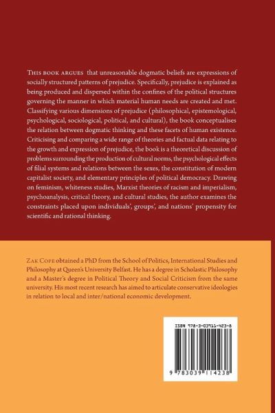 This book argues that unreasonable dogmatic beliefs are expressions of socially structured patterns of prejudice. Specifically, prejudice is explained as being produced and dispersed within the confines of the political structures governing the manner in which material human needs are created and met. Classifying various dimensions of prejudice (philosophical, epistemological, psychological, sociological, political, and cultural), the book conceptualises the relation between dogmatic thinking and these facets of human existence. Criticising and comparing a wide range of theories and factual data relating to the growth and expression of prejudice, the book is a theoretical discussion of problems surrounding the production of cultural norms, the psychological effects of filial systems and relations between the sexes, the constitution of modern capitalist society, and elementary principles of political democracy. Drawing on feminism, whiteness studies, Marxist theories of racism andimperialism, psychoanalysis, critical theory, and cultural studies, the author examines the constraints placed upon individuals', groups', and nations' propensity for scientific and rational thinking.