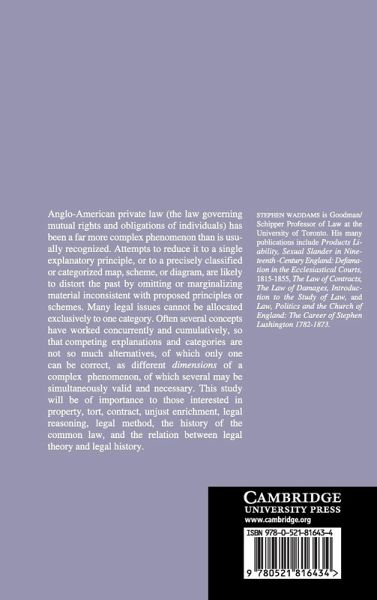 Anglo-American private law (the law governing mutual rights and obligations of individuals) has been a far more complex phenomenon than is usually recognized. Attempts to reduce it to a single explanatory principle, or to a precisely classified or categorized map, scheme, or diagram, are likely to distort the past by omitting or marginalizing material inconsistent with proposed principles or schemes. Many legal issues cannot be allocated exclusively to one category. Often several concepts have worked concurrently and cumulatively, so that competing explanations and categories are not so much alternatives, of which only one can be correct, as different dimensions of a complex phenomenon, of which several may be simultaneously valid and necessary. This study will be of importance to those interested in property, tort, contract, unjust enrichment, legal reasoning, legal method, the history of the common law, and the relation between legal theory and legal history.