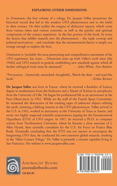 In DIMENSIONS, the first volume of a trilogy, Dr. Jacques Vallee reexamines the historical record that led to the modern UFO phenomenon and to the belief in alien contact. He then tackles the enigma of abduction reports, which come from various times and various countries, as well as the psychic and spiritual components of the contact experience. In the last portion of the book, he notes the factors that inhibit research into the phenomenon--the triple coverup and political motivations--and concludes that the extraterrestrial theory is simply not strange enough to explain the facts.