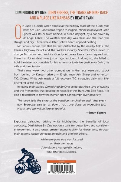 On June 14, 2018, when almost at the halfway mark of the 4,208-mile Trans Am Bike Race from Oregon to Virginia, Minnesotan cyclist John Egbers was struck from behind, in broad daylight, by a car driven by Mr Angel Labra. The weather that day was clear, and the road was straight and dry. Three weeks later, John's heart stopped beating. Mr Labra's excuse was that he was distracted by the nearby fields. The Kansas Highway Patrol and the Wichita County Sheriff's Office failed to charge Mr Labra, and Wichita County Attorney Laura Lewis agreed with them that John's death was just a tragic accident. In doing so, she failed to hold the driver accountable for his actions or to deliver justice for John, his wife and their family. That same week two other competitors in the race were also struck from behind by Kansan drivers - Englishman Ash Sharp and American T.C. Cheng. While Ash made a full recovery, T.C. struggles daily with life-changing spinal injuries. In telling their stories, Diminished By One celebrates their love of cycling and the friendships that develop in races like the Trans Am Bike Race. It is also a testament to how the human spirit can triumph over adversity.