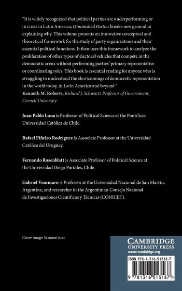 1. Introduction Juan Pablo Luna, Rafael Piñeiro Rodríguez, Fernando Rosenblatt and Gabriel Vommaro; 2. The Case of Uruguay's Frente Amplio Verónica Pérez Bentancur, Rafael Piñeiro Rodríguez and Fernando Rosenblatt; 3. Horizontal coordination and vertical aggregation mechanisms of the PRO in Argentina and its subnational variations Gabriel Vommaro; 4. Bolivia's Movement Toward Socialism (MAS): A Political Party Based on and Anchored in Social Movements Santiago Anria; 5. The complex interaction between vertical interest aggregation and horizontal coordination: The PRD and MORENA in Mexico Hélène Combes; 6. PLN and PAC: Two Costa Rican parties with evolving constituencies in opposite directions Ronald Alfaro-Redondo and Steffan Gómez-Campos; 7. The Case of the Traditional Parties in Paraguay Diego Abente Brun; 8. The Colombian Liberal Party and Conservative Party: From Political Parties to Diminished Subtypes Laura Wills-Otero, Bibiana Ortega and Viviana Sarmiento; 9. 'Normal' Parties in Extraordinary Times: The Case of Primero Justicia and Voluntad Popular in Venezuela Jennifer Cyr; 10. Diminished by Design: Ecuador's Alianza PAIS Catherine M. Conaghan; 11. The Chilean PPD: A Loose Confederation of Leaders Rafael Piñeiro Rodríguez, Fernando Rosenblatt and Sergio Toro Maureira; 12. Fujimorismo and the Limits of Democratic Representation in Peru Alberto Vergara and María Claudia Augusto; 13. The Unidad Nacional de la Esperanza: Guatemala's Only True Political Party? Omar Sanchez-Sibony and Jonatán Lemus; 14. Conclusions Juan Pablo Luna, Rafael Piñeiro Rodríguez, Fernando Rosenblatt and Gabriel Vommaro.