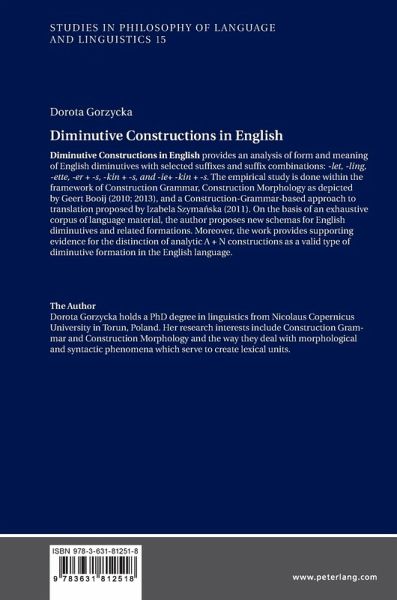 Diminutive constructions in English provides an analysis of form and meaning of English diminutives with selected suffixes and suffix combinations: -let, -ling, -ette, -er+ -s, -kin + -s, and -ie+ -kin +-s. The empirical study is done within the framework of Construction Grammar, Construction Morphology as depicted by Geert Booij (2010; 2013), and a Construction-Grammar-based approach to translation proposed by Izabela Szymanska (2011). On the basis of an exhaustive corpus of language material, the author proposes new schemas for English diminutives and related formations. Moreover, the work provides supporting evidence for the distinction of analytic A + N constructions as a valid type of diminutive formation in the English language.