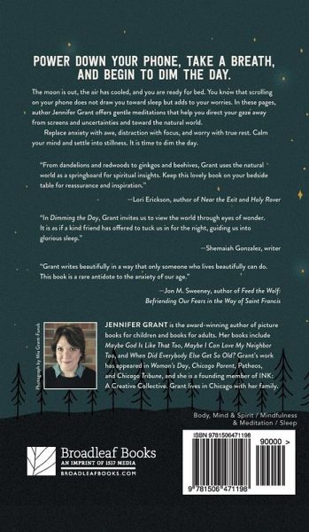 The moon is out, the air has cooled, and you are ready for bed. You know that scrolling on your phone does not draw you toward sleep but adds to your worries. Power down your phone, take a breath, and begin to dim the day. Research suggests that we should refrain from screens at bedtime. But it can be hard to give up social media and news without something to take its place. In these pages, author Jennifer Grant offers gentle meditations that help you direct your gaze away from screens and uncertainties and toward the natural world. Dimming the Day guides you to focus on the wonders of God's good earth, from the ordinary head of a dandelion to the exquisite beauty of a fractal. Replace anxiety with awe, distraction with focus, and worry with true rest. Calm your mind and settle into stillness. It is time to dim the day.