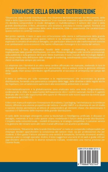 "Dinamiche della Grande Distribuzione: Una Disamina Multidimensionale dei Meccanismi, delle Sfide e delle Opportunità nel Retail Moderno" è un manuale esaustivo e approfondito, destinato a chi desidera comprendere in modo dettagliato e multidisciplinare il settore del retail e della grande distribuzione. Il libro, attraverso una struttura articolata in trenta capitoli, fornisce una panoramica olistica e aggiornata delle varie dinamiche, sfide e opportunità che caratterizzano questo settore in continua evoluzione. Nel primo capitolo, il testo si apre con un'incursione nella storia e nell'evoluzione della grande distribuzione, delineando come questo settore si sia sviluppato e modellato nel tempo. Viene esplorato il concetto di vendita al dettaglio, con particolare attenzione alle trasformazioni storiche e ai cambiamenti socio-economici che hanno influenzato l'emergere e la crescita del settore. Proseguendo, il libro approfondisce l'analisi delle strategie di marketing e comunicazione implementate dalla grande distribuzione, con una riflessione dettagliata sulle tecniche promozionali, sulla pubblicità e sulla gestione del brand. Viene esaminato il ruolo cruciale delle tecnologie digitali e dei social media nella definizione delle strategie di marketing, sottolineando come l'interazione con i clienti sia diventata sempre più centrale. La relazione con i fornitori è un altro tema cardine affrontato nel manuale, mettendo in luce le strategie di acquisto, le negoziazioni e le partnership, oltre a svelare come la gestione ottimale della supply chain possa contribuire significativamente al successo di un'impresa nel campo del retail. Il testo si sofferma poi sulle normative e le regolamentazioni che incorniciano la grande distribuzione, fornendo una panoramica completa delle leggi, delle direttive e delle regole etiche da rispettare, con un'attenzione particolare alla sostenibilità ambientale e sociale. L'internazionalizzazione e la globalizzazione sono analizzate sotto una lente d'ingrandimento, evidenziando le sfide e le opportunità dell'espansione oltre i confini nazionali, mentre il capitolo dedicato alle crisi e alle opportunità offre spunti di riflessione sulle lezioni apprese da eventi quali la pandemia da COVID-19. Il libro non manca di esplorare l'innovazione di prodotto, il packaging, l'etichettatura e le tendenze future, offrendo una visione prospettica del settore. L'analisi SWOT e la disamina di casi di studio e success stories permettono al lettore di comprendere gli elementi chiave che determinano il successo o il fallimento delle imprese della grande distribuzione. Il ruolo delle tecnologie emergenti, come la blockchain e l'intelligenza artificiale, è discusso in dettaglio, mettendo in luce come queste stiano modellando il futuro della grande distribuzione. L'impatto sulla comunità locale, i modelli di business, le strategie competitive, il customer service e la gestione dei reclami sono altri temi cruciali affrontati con acume e profondità. In conclusione, "Dinamiche della Grande Distribuzione" si rivela un compendio indispensabile per chiunque desideri approfondire la conoscenza del settore retail, sia per professionisti che per studenti. Il libro guida il lettore attraverso una varietà di tematiche, fornendo strumenti analitici, esempi pratici e consigli operativi. Inoltre, il testo suggerisce una serie di siti web e guide utili per approfondire ulteriormente le diverse tematiche trattate, rendendolo una risorsa preziosa per l'utente finale.