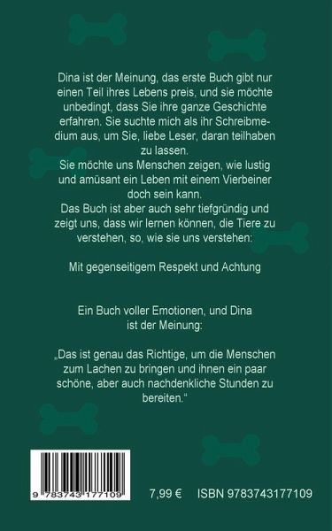 Liebe Leser und Hundefreunde, vielleicht haben Sie schon mein erstes Buch gelesen. Es erzählt die Geschichte meiner Hündin Dina, die mir zehn Jahre ihres Lebens treu zur Seite stand. Sie brachte mich dazu, meine Gabe zu erkennen, und suchte mich als ihr Schreibmedium aus. So habe ich die Möglichkeit, ihr Leben aus ihrer Sicht zu erzählen. Sie erlaubt uns Einblicke in ihre tiefsten Gefühle und lässt uns an ihrem Leben teilhaben. Dina ist doch der Meinung, das erste Buch gibt nur einen Teil ihres Lebens preis, und sie möchte unbedingt, dass Sie ihre ganze Geschichte erfahren. Sie hat dem Buch eine gewisse Tiefgründigkeit verliehen und möchte, dass wir lernen, die Tiere so zu verstehen, wie sie uns verstehen. Dass wir den Tieren zeigen, hey, es gibt Menschen, denen wir wieder unser Vertrauen schenken können. Wenn Sie Dina schon kennen, wissen Sie, dass es auch wieder einiges zu lachen gibt. Wissen wir nicht alle, was unsere Tiere so alles anstellen, um uns den Alltag für kurze Zeit vergessen zu lassen. Alleine schon die Mimik, wenn sie etwas angestellt haben. "Ich war das nicht, nein nieeeeemals, ich doch nicht." Es gibt keine besseren Schauspieler als unsere Tiere. Seien wir ehrlich, lange können wir ihnen doch nicht böse sein, egal, was sie gerade angestellt haben. Ich wünsche Ihnen viel Spaß beim Erleben unserer Geschichte