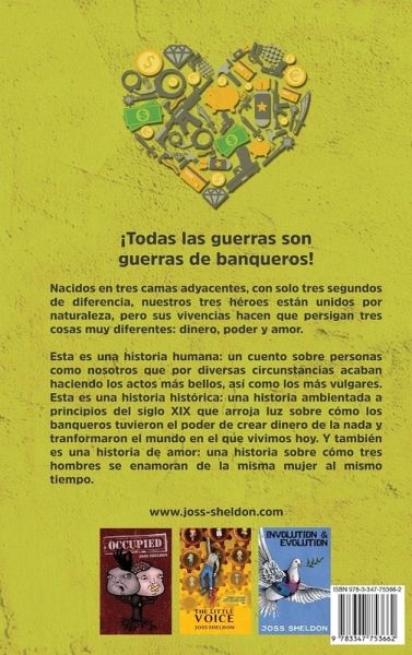 ¡¡¡EL BEST-SELLER #1 QUE LOS PECES GORDOS NO QUIEREN QUE LEAS!!! Obtén tu copia de la nueva y radical novela de Joss Sheldon ya mismo... Nuestros héroes nacen en tres camas adyacentes, con sólo tres segundos de diferencia. Unidos por un rasgo en común, a menudo sienten las emociones de los otros, como si esas emociones fueran las de ellos. Cuando un incendio arrasa sus casas y acaba con la vida de sus familias, ellos quedan destrozados. Mayer es adoptado por una pareja adinerada, Archibald por un tío y tía amorosos, y Hugo es abandonado en un hospicio. Finalmente se reencuentran, muchos años después, sólo para enamorarse de la misma mujer, al mismo tiempo; sintiendo el amor del otro como si fuera el propio. Pero, convertidos en tres personas muy diferentes, por haber tenido tres crianzas muy diferentes, la cortejan de maneras muy diferentes. Las consecuencias son extremas; inspirando a nuestros héroes a pasar sus vidas persiguiendo dinero, poder y amor, con la vana esperanza de que estas cosas les ayuden a conquistar a la chica. Moviéndonos a través de la historia; vemos cómo banqueros crean dinero de la nada y el Imperio Británico se apodera del mundo, antes de llegar al final más emocionante. Esta es una historia que te hará reír, llorar, temblar, sonreír, gritar y vociferar. Realmente es una obra maestra moderna, diferente de todas las otras historias que has leído... "Asombroso" - The Huffington Post "Picaresco" - Scottish Left Review "Atrapante" - The Avenger "Un trabajo de arte" - Pak Asia Times "Extrañamente afable" - The Tribune "Una montaña rusa" - BuzzFeed ¡¡¡DESPLÁZATE HACIA ARRIBA PARA OBTENER SU COPIA AHORA!!!