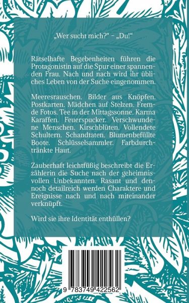 Wer sucht mich? -- Du!Rätselhafte Begebenheiten führen die Protagonistin auf die Spur einer spannenden Frau. Nach und nach wird ihr übliches Leben von der Suche eingenommen. Meeresrauschen. Bilder aus Knöpfen. Postkarten. Mädchen auf Stelzen. Tee in der Mittagssonne. Karma Karaffen. Feuerspucker. Verschwundene Menschen. Kirschblüten. Fremde Fotos. Blumenbefüllte Boote. Vollendete Schultern. Schandtaten. Schlüsselsammler. Farbdurchtränkte Haut. Zauberhaft leichtfüßig beschreibt die Erzählerin die Suche nach der geheimnisvollen Unbekannten. Rasant und dennoch detailreich werden Charaktere und Ereignisse nach und nach miteinander verknüpft. Wird sie ihre Identität enthüllen?