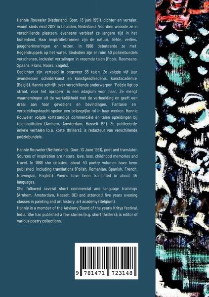 Tweetalig - bilingual: Dutch and English. Korte verhalen, over allerlei onderwerpen, soms flashbacks. Short stories about all sorts of subjects, sometimes flashbacks. Hannie Rouweler (Nederland, Goor, 13 juni 1951), dichter en vertaler, woont sinds eind 2012 in Leusden, Nederland. Voordien woonde ze in verschillende plaatsen, eveneens verbleef ze langere tijd in het buitenland. Haar inspiratiebronnen zijn de natuur, liefde, verlies, jeugdherinneringen en reizen. In 1988 debuteerde ze met Regendruppels op het water. Sindsdien zijn er ruim 40 poëziebundels verschenen, inclusief vertalingen in vreemde talen (Pools, Roemeens, Spaans, Frans, Noors, Engels). Gedichten zijn vertaald in ongeveer 35 talen. Ze volgde vijf jaar avondlessen schilderkunst en kunstgeschiedenis, kunstacademie (België). Hannie schrijft over verschillende onderwerpen. 'Poëzie ligt op straat, voor het oprapen', is een adagium voor haar. Ze mengt waarnemingen uit de werkelijkheid met de verbeelding en geeft een draai aan haar gevoelens en bevindingen. Fantasie en verbeeldingskracht spelen een belangrijke rol in haar werken. Hannie Rouweler volgde kortstondige commerciële en talen opleidingen bij taleninstituten (Arnhem, Amsterdam, Hasselt BE). Ze publiceerde enkele verhalen (o.a. korte thrillers); is redacteur van verschillende poëziebundels. Hannie Rouweler (Netherlands, Goor, 13 June 1951), poet and translator. Sources of inspiration are nature, love, loss, childhood memories and travel. In 1988 she debuted, about 40 poetry volumes have been published, including translations (Polish, Romanian, Spanish, French, Norwegian, English). Poems have been translated in about 35 languages. She followed several commercial and language trainings (Arnhem, Amsterdam, Hasselt BE) and attended five years evening classes in painting and art history, art academy (Belgium). Hannie is a member of the Advisory Board of the yearly Kritya festival, India. She has published a few stories (e.g. short thrillers); is editor of various poetry collections.