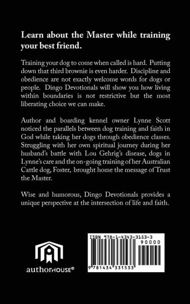 Learn about the Master while training your best friend Training your dog to come when called is hard. Putting down that third brownie is even harder. Discipline and obedience are not exactly welcome words for dogs or people. Dingo Devotionals will show you how living within boundaries is not restrictive but the most liberating choice we can make. Author and boarding kennel owner Lynne Scott noticed the parallels between dog training and faith in God while taking her dogs through obedience classes. Struggling with her own spiritual journey during her husband's battle with Lou Gehrig's disease, dogs in Lynne's care and the on-going training of her Australian Cattle dog, Foster, brought home the message of Trust the Master. Wise and humorous, Dingo Devotionals provides a unique perspective at the intersection of life and faith.
