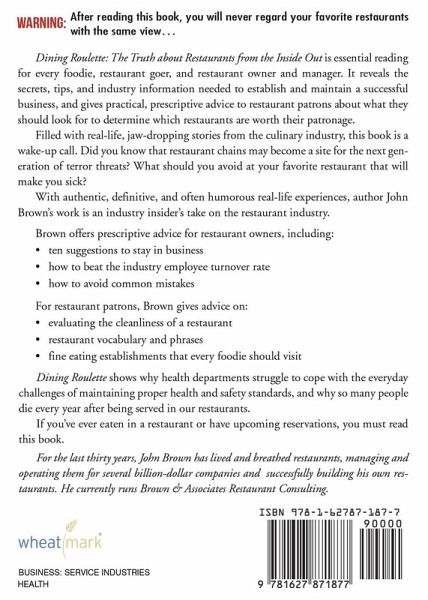 Dining Roulette: The Truth about Restaurants from the Inside Out is essential reading for every foodie, restaurant goer, and restaurant owner and manager. It reveals the secrets, tips, and industry information needed to establish and maintain a successful business, and gives practical, prescriptive advice to restaurant patrons about what they should look for to determine which restaurants are worth their patronage. Filled with real-life, jaw-dropping stories from the culinary industry, this book is a wake-up call. Did you know that restaurant chains may become a site for the next generation of terror threats? What should you avoid at your favorite restaurant that will make you sick? With authentic, definitive, and often humorous real-life experiences, author John Brown's work is an industry insider's take on the restaurant industry. Brown offers prescriptive advice for restaurant owners, including: ten suggestions to stay in business, how to beat the industry employee turnover rate, and how to avoid common mistakes. For restaurant patrons, Brown gives advice on: evaluating the cleanliness of a restaurant, restaurant vocabulary and phrases, and fine eating establishments that every foodie should visit. Dining Roulette shows why health departments struggle to cope with the everyday challenges of maintaining proper health and safety standards, and why so many people die every year after being served in our restaurants. If you've ever eaten in a restaurant or have upcoming reservations, you must read this book.