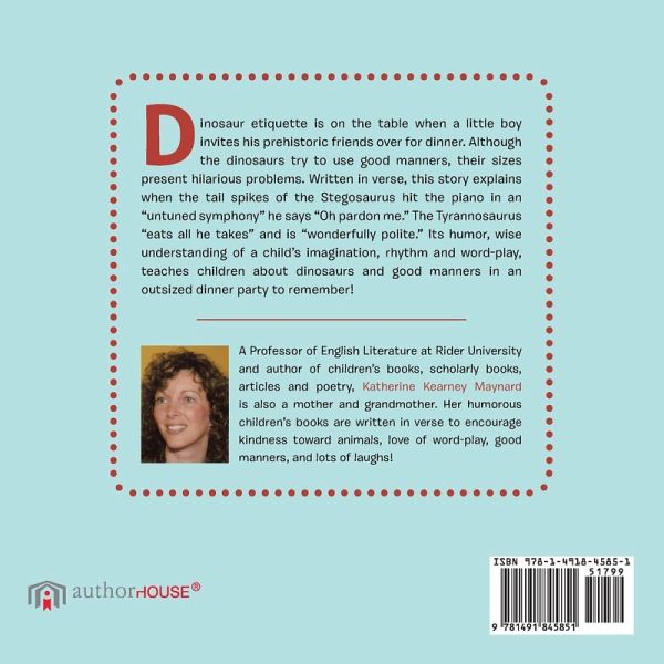 Dinosaur etiquette is on the table when a little boy invites his prehistoric friends over for dinner. Although the dinosaurs try to use good manners, their sizes present hilarious problems. Written in verse, this story explains when the tail spikes of the Stegosaurus hit the piano in an "untuned symphony" he says "Oh pardon me." The Tyrannosaurus "eats all he takes" and is "wonderfully polite." Its humor, wise understanding of a child's imagination, rhythm and word-play, teaches children about dinosaurs and good manners in an outsized dinner party to remember!